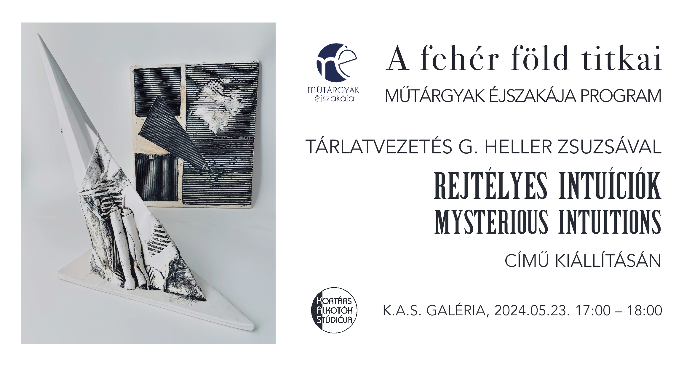 G.Heller Zsuzsa egyéni kiállítása a K.A.S. Galériában. A Rejtélyes intuíciók című kiállítás kerámia szobrai megfejtésre várnak. Ki ne szeretné tudni, hogy milyen gondolatokat, érzéseket rejtenek az egyedi, a művészre olyannyira jellemző formavilágú alkotások. Vonzzák a tekintetet, mert szeretnénk megfejteni titkukat, a művész titkát. Hogyan és miért alakult ki a jellegzetes éles szögben végződő, szinte szúrós szobortest. Az pedig, hogy hogyan készült, minden kerámiatárgy kapcsán olyan rejtély, melyet szeretnénk megismerni. Minderről a leghitelesebben maga a művész fog beszélni, beszélgetni a résztvevőkkel.