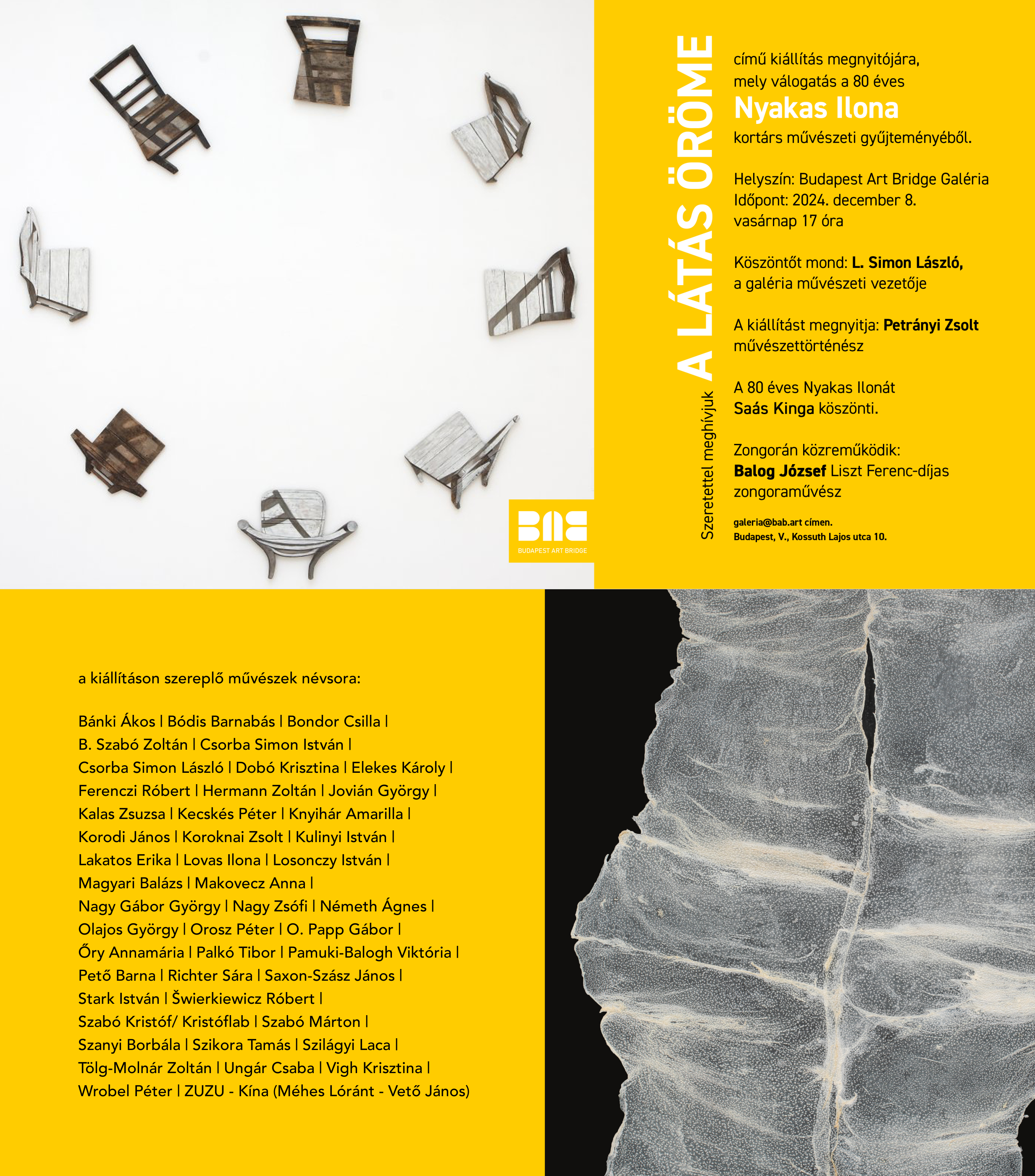 Szeretettel meghívjuk A látás öröme című kiállítás megnyitójára, mely válogatás a 80 éves Nyakas Ilona kortárs művészeti gyűjteményéből.