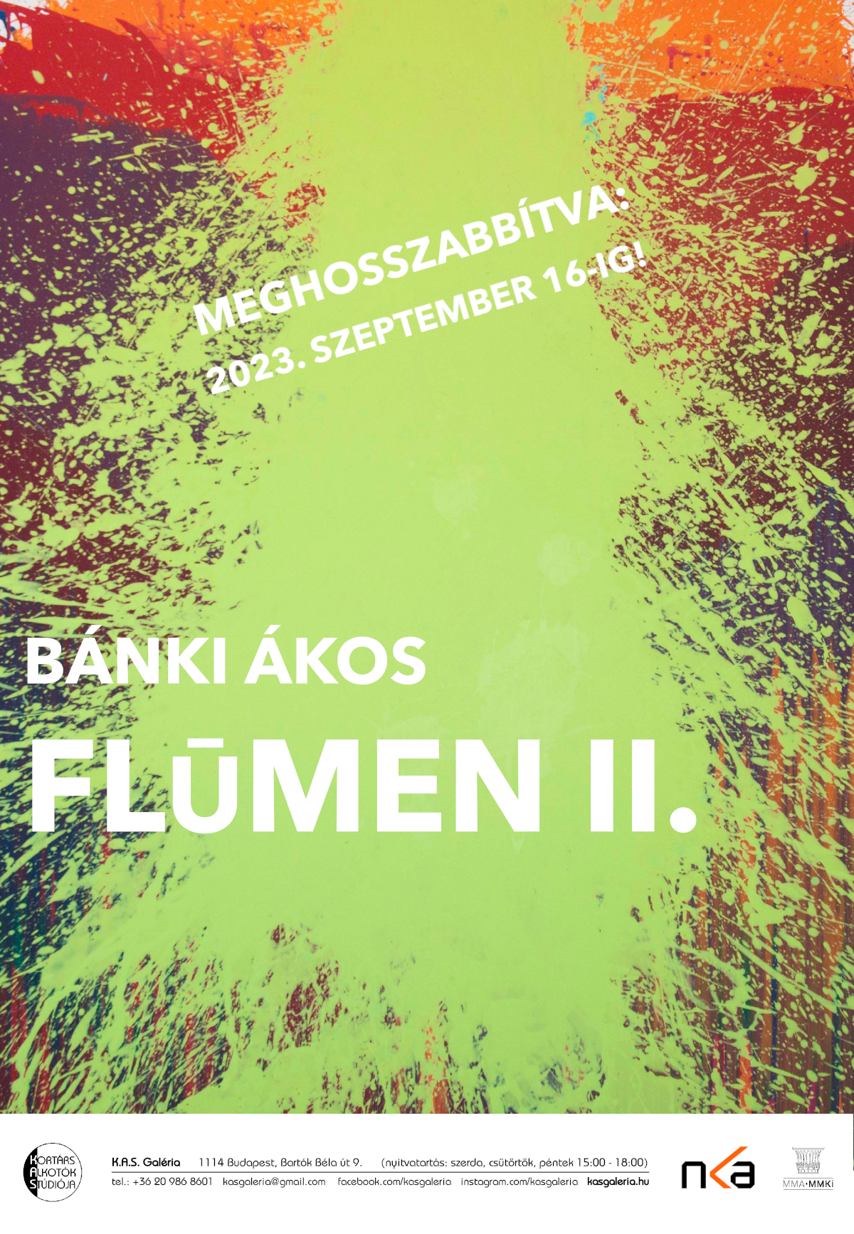 Bánki Ákos legújabb munkáit bemutató Flūmen II. című kiállítás a művész harmadik önálló tárlataként kerül megrendezésre a K.A.S. Galériában. Bánki sorozatokban gondolkodik és a mostani kiállítás a 2019-ben, Barcelonában indult gondolat és gesztus érzéki folytatása.